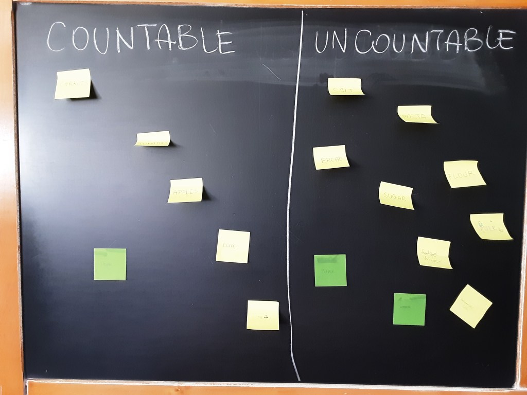 Fase 2: organizzare gli studenti in piccoli gruppi (massimo 4 componenti) e chiedere a ogni gruppo di avvicinarsi alla cattedra e osservare attentamente gli alimenti. Una volta osservati gli alimenti gli studenti tornano alle loro postazioni e disegnano una tabella, organizzando gli alimenti disposti sulla cattedra in due categorie (countable / uncountable nouns). Nella fase di WCFB (whole class feedback) ogni componente del gruppo, a turno, prende un post-it con il nome dell’alimento e lo attacca nella colonna della categoria corrispondente.